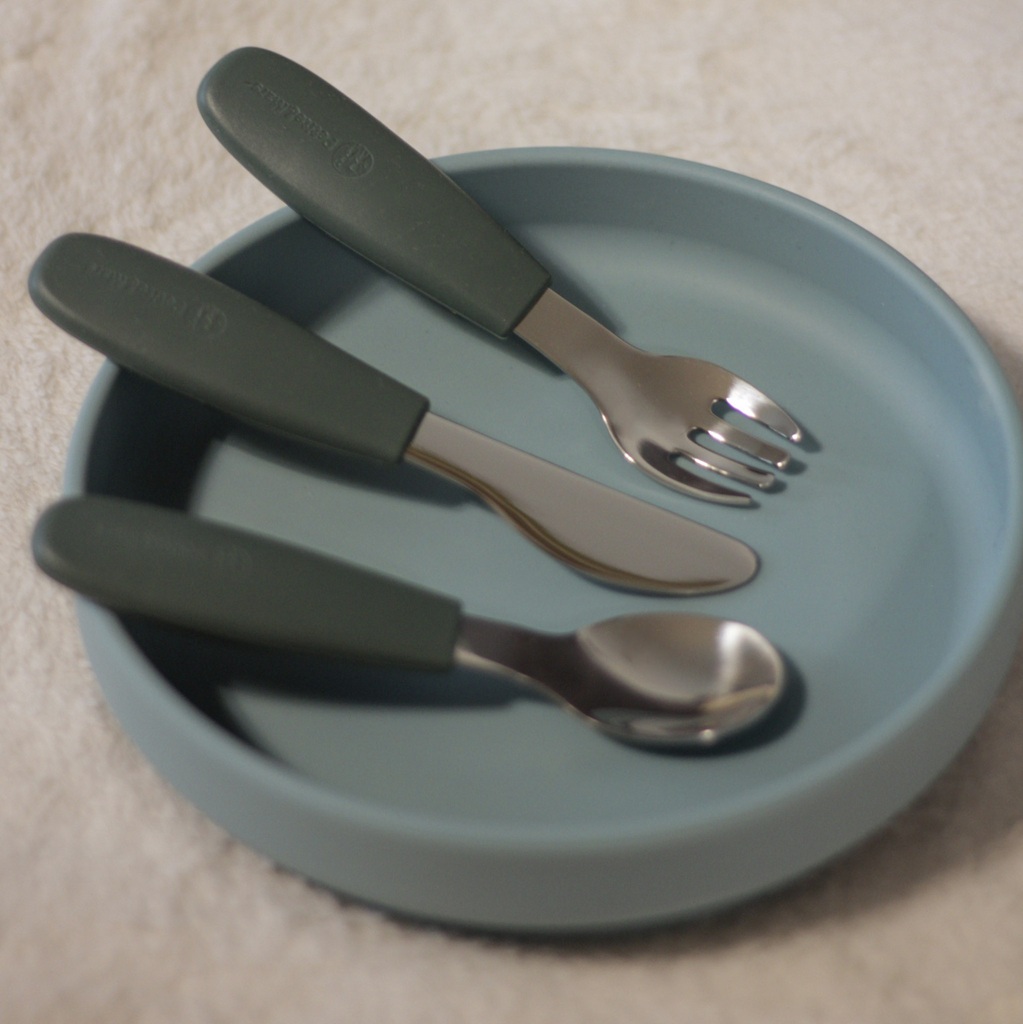 PETITE e MARS Stainless steel cutlery set with silicone handle Take e Match Misty Green 12m+